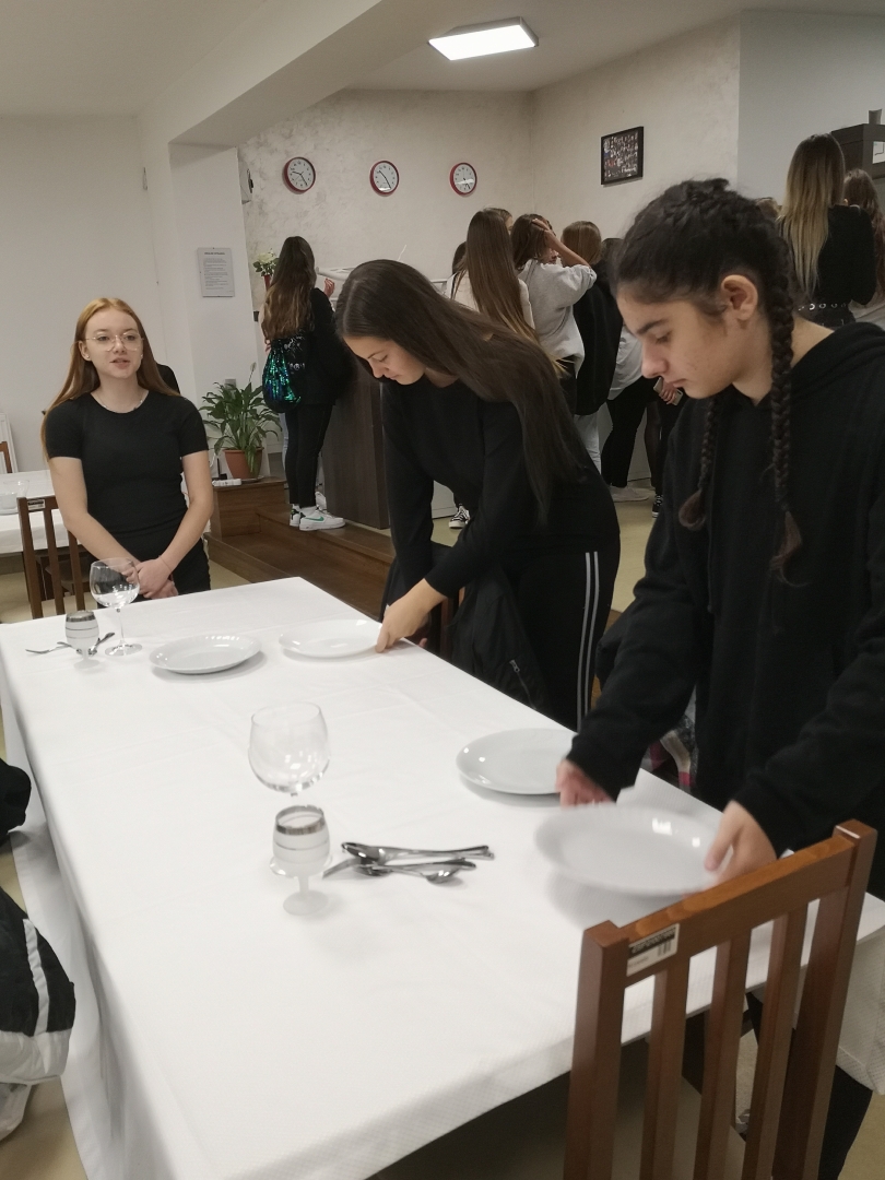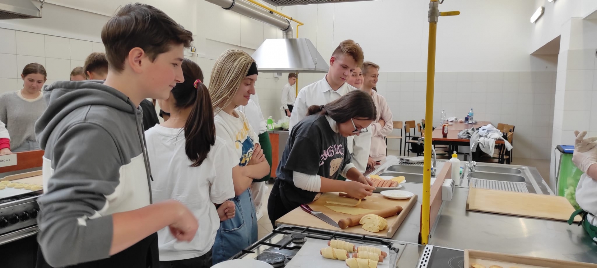 W tym dniu Ósmoklasiści mieli możliwość zapoznać się z hotelarstwem i gastronomią od strony praktycznej. Uczniowie z klasy 3 THg, 3 kbg i 3 wag pod okiem pań: Sylwii Mleczko-Fikas (koordynator projektu), Agnieszki Kornaś i Bożeny Tlałki przygotowali stanowiska, przy których wraz z młodszymi koleżankami i kolegami ćwiczyli umiejętności nakrywania i dekoracji stołu, parzenia kawy oraz przygotowywania słodkich i słonych przekąsek. Wspólne ćwiczenia, a także późniejsza degustacja własnoręcznie przygotowanych smakołyków były dla uczestników doskonałą okazją do rozmów i znalezienia odpowiedzi na wiele pytań.