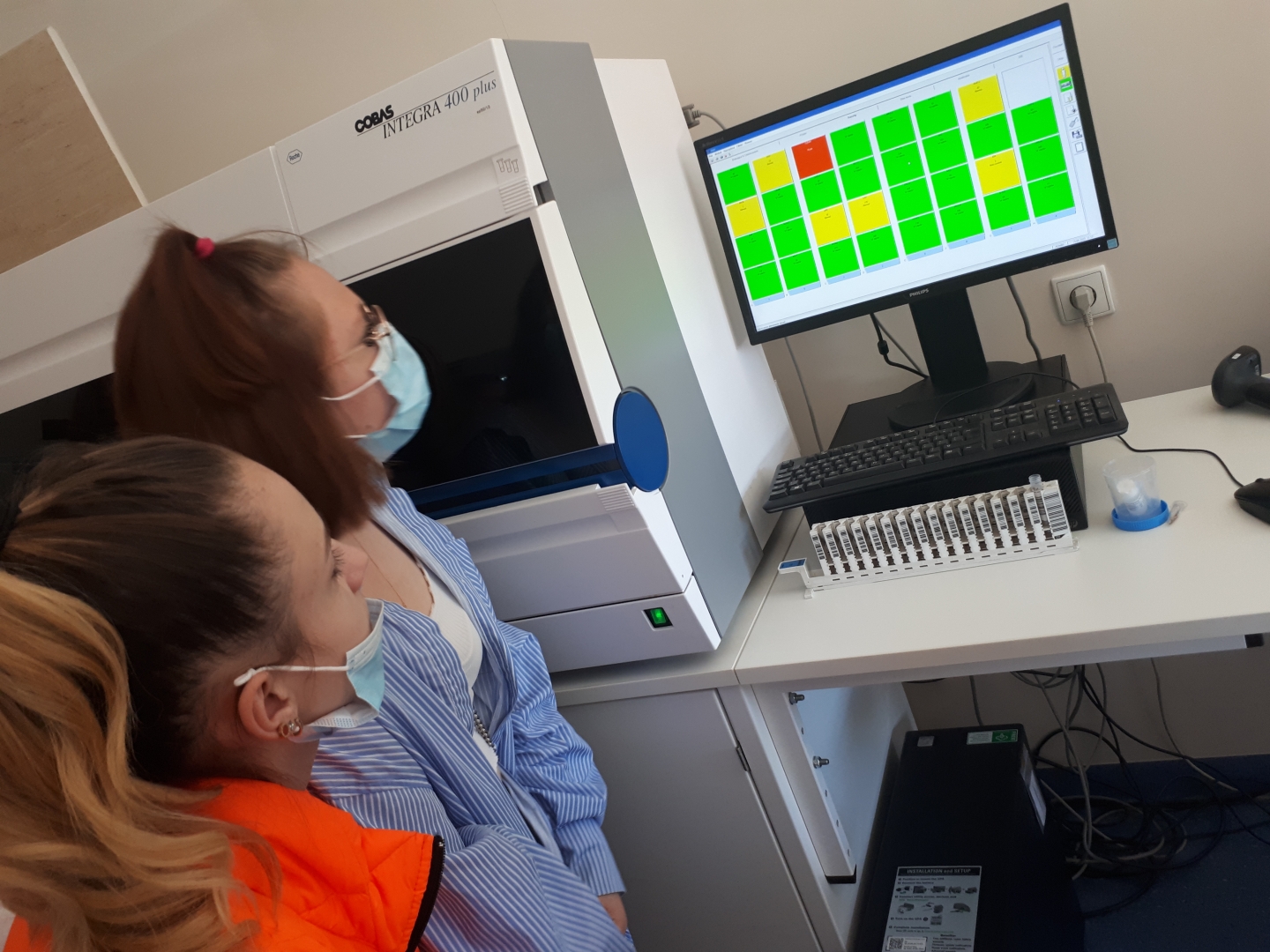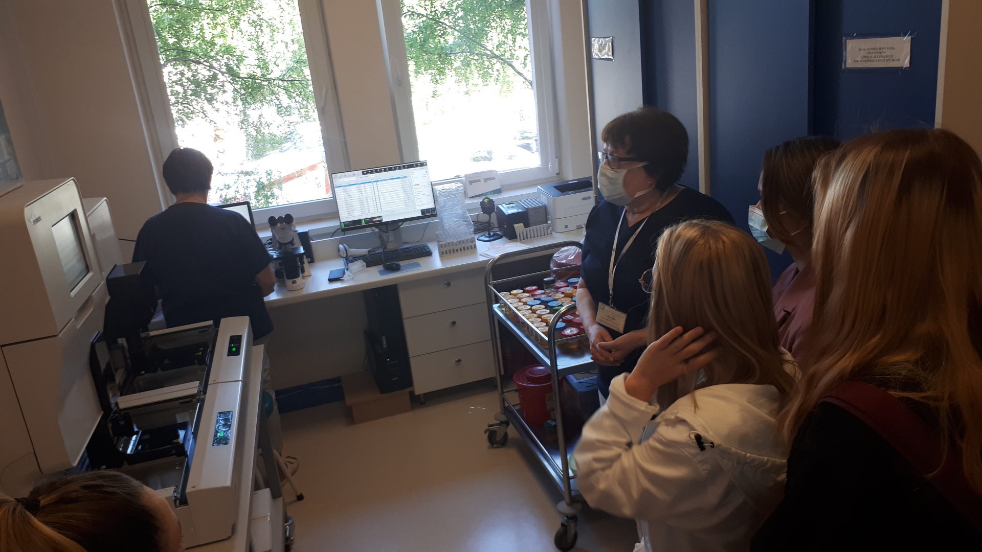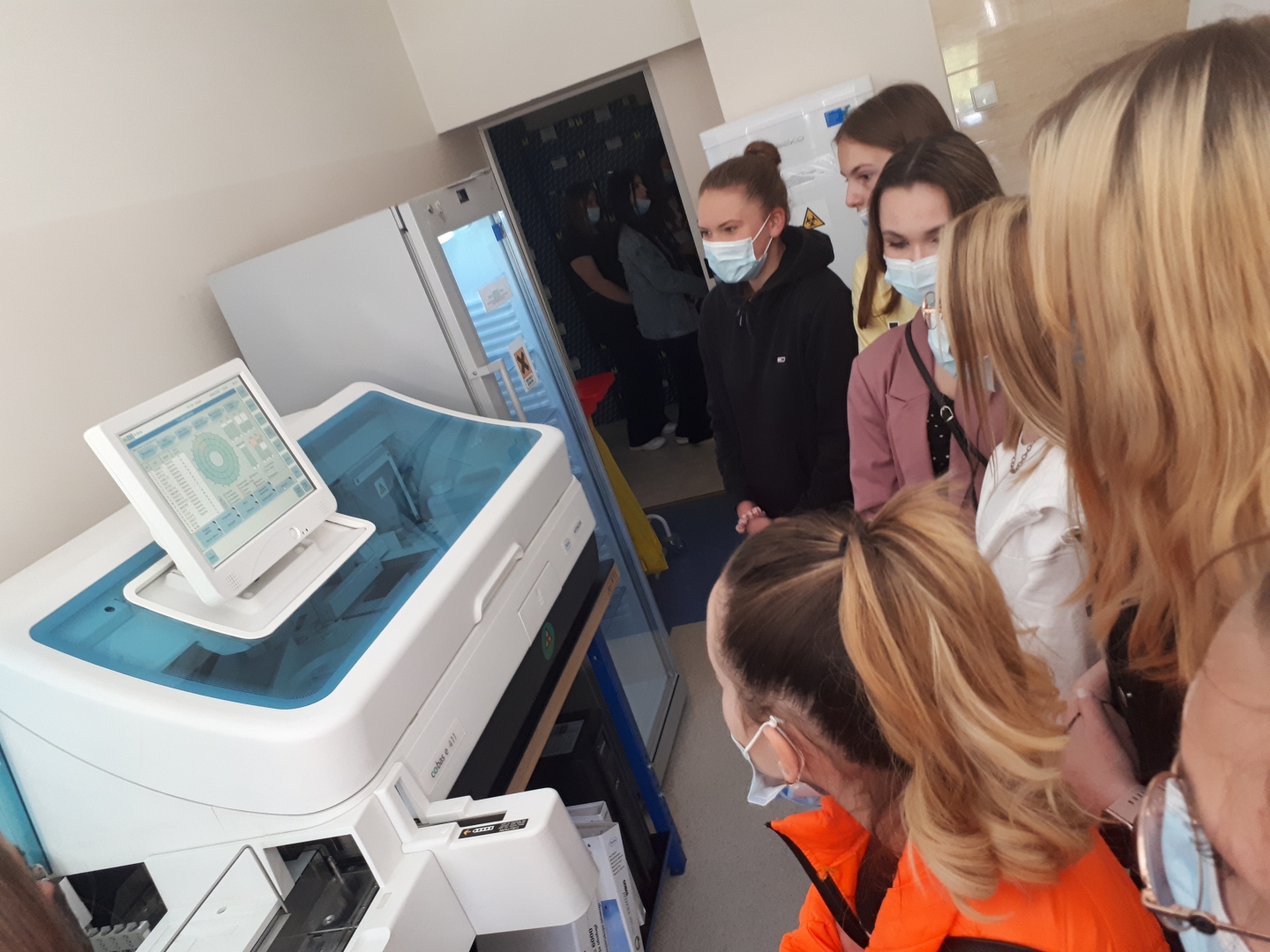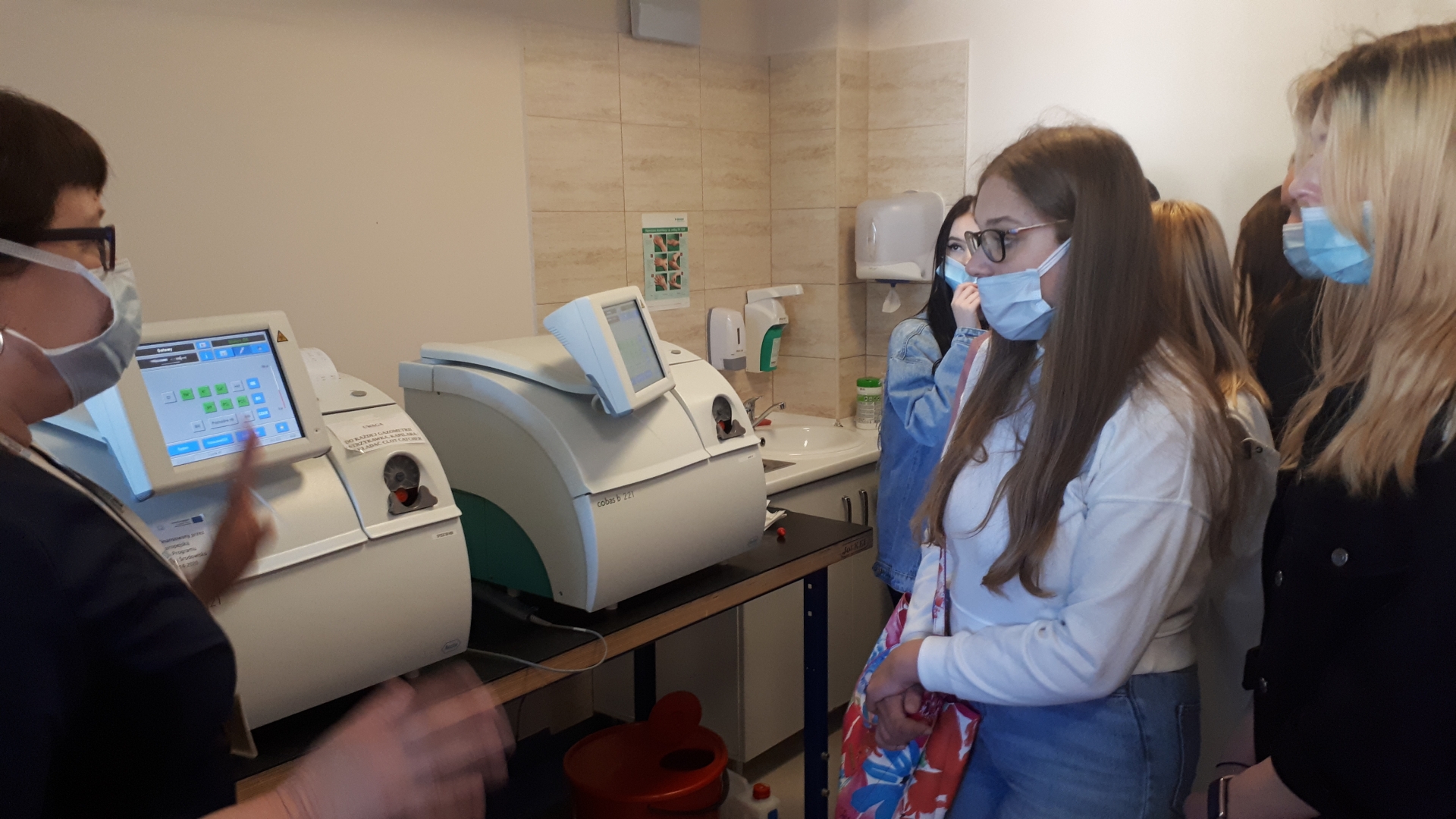 Po oficjalnym spotkaniu młodzież pod opieką p. Ewy Chmielarz- Żwawa zwiedziła obszary szpitala normalnie niedostępne pacjentom. Uczniowie mieli możliwość przyjrzeć się pracy Zakładu Diagnostyki Laboratoryjnej, gdzie w szczegóły wprowadzała ich pani Kierownik mgr anal. med. Ewa Biel. Dzięki jej uprzejmości młodzież mogła zapoznać się z nowoczesnym sprzętem wykorzystywanym do analizy próbek płynów ustrojowych i zobaczyć jak wygląda codzienna praca w tym sektorze.