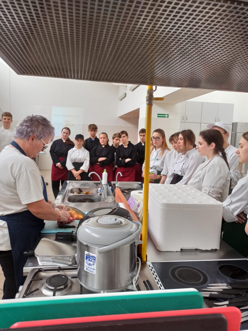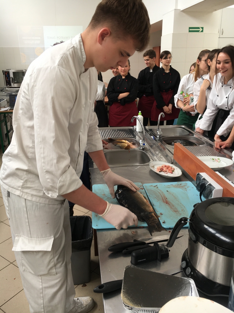 Spotkanie dedykowane było dla uczniów klas gastronomicznych oraz zainteresowanych nauczycieli - wielbicieli ryb, a zwłaszcza karpia. Zajęcia odbyły się w ramach lekcji otwartej i koleżeńskiej, realizowanej przez panie: Sylwia Smaga - Olchawa oraz Agnieszka Kornaś.