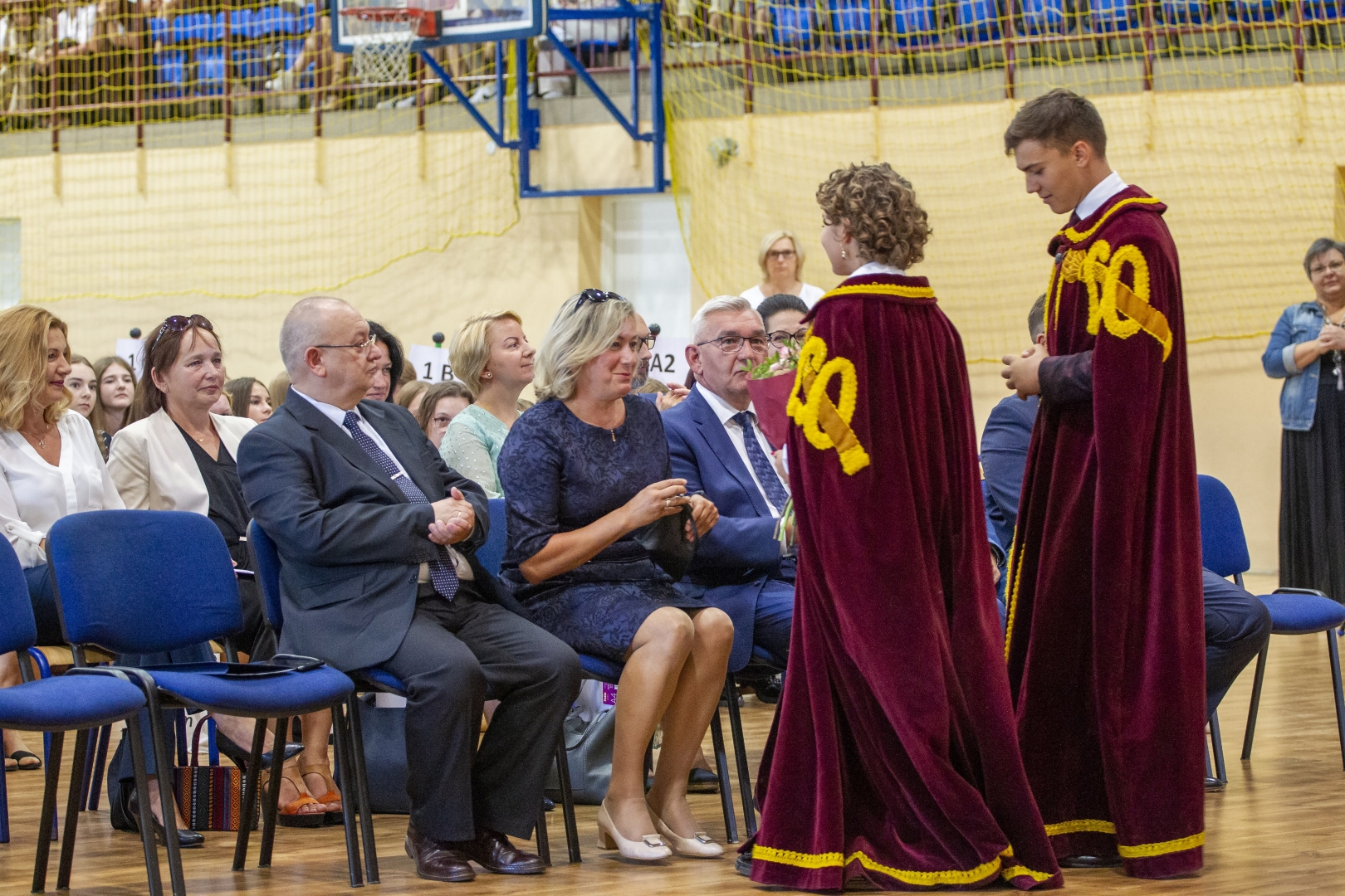 Część oficjalną poprowadzili Marszałkowie Liceum - Julia Pajor i Wiktor Minor - ubrani w tradycyjne togi, nawiązujące do ponad 110 letniej tradycji szkoły. Po wprowadzeniu sztandaru, odśpiewaniu hymnu i powitaniu gości, delegacja uczniów udała się pod tablicę pamiątkową, gdzie co roku zapala się znicze w hołdzie ofiarom II wojny światowej. Uroczystość wzbogaciły piosenki w wykonaniu uczennic LO – Julii i Mileny Kuta, którym akompaniował nowy nauczyciel edukacji medialno – technicznej pan Robert Sowa.