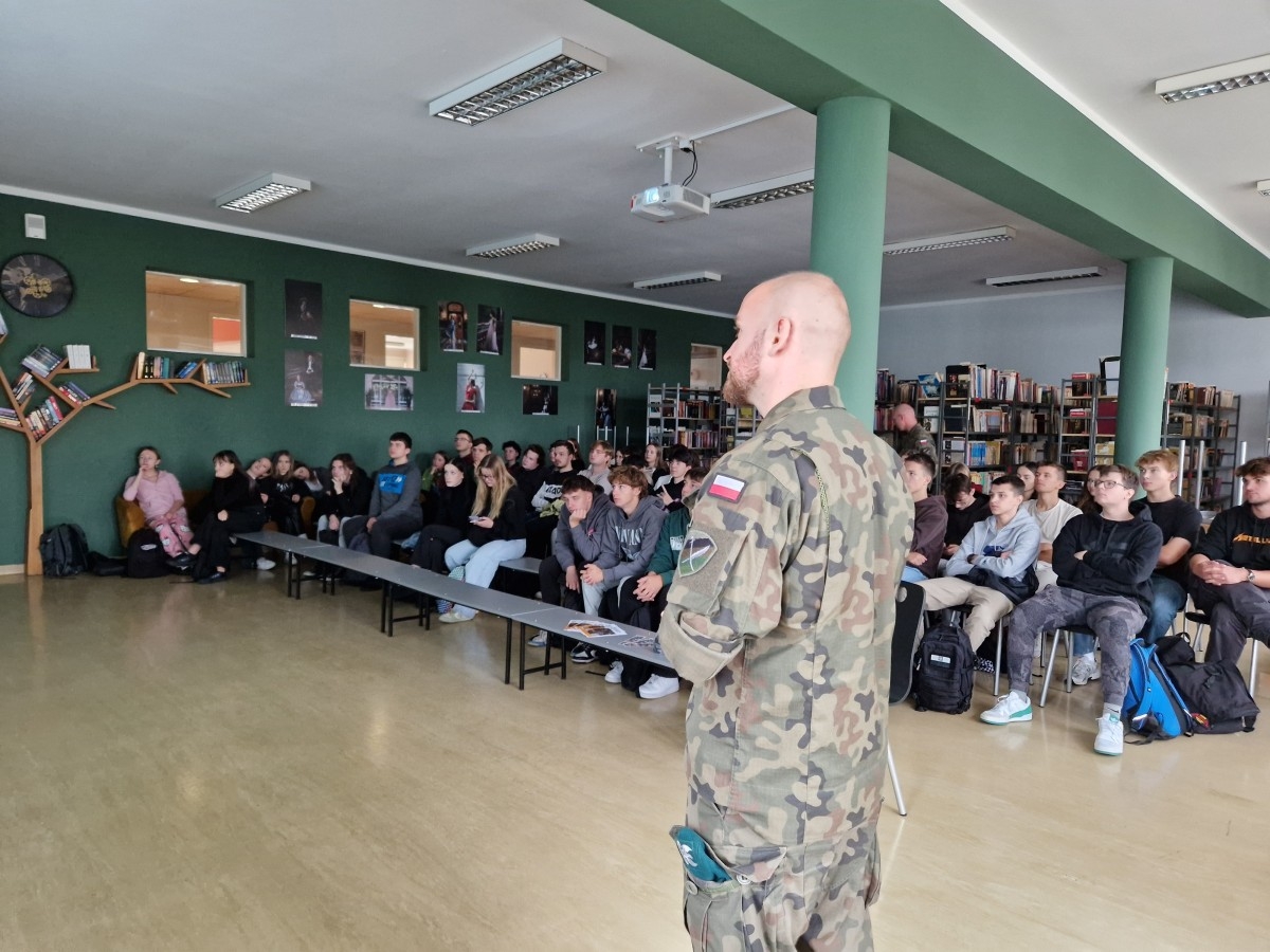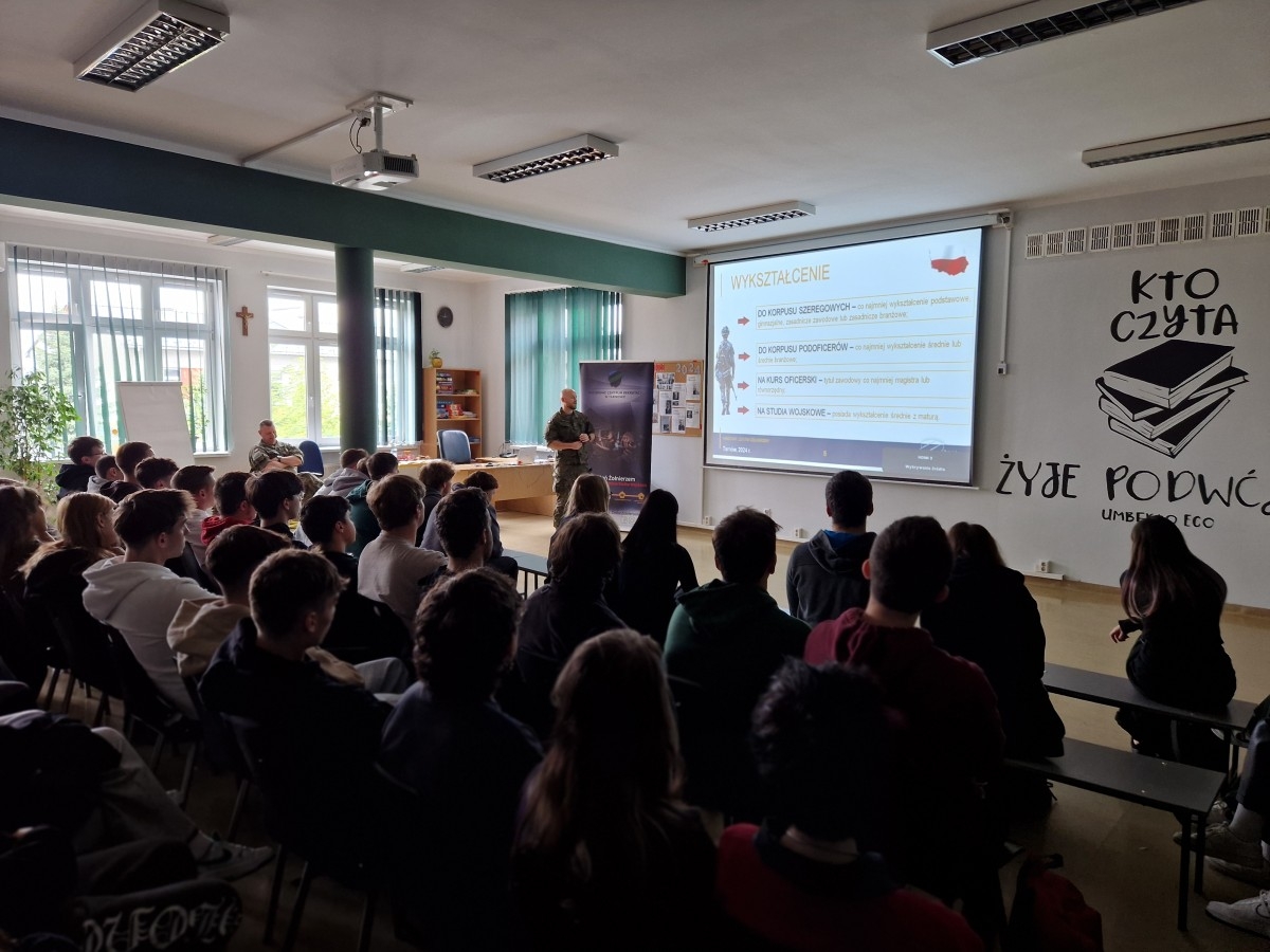 Mając na uwadze zwiększone zainteresowanie młodzieży służbą w Wojsku Polskim oraz potrzebę wspólnego działania na rzecz obronności państwa i wychowania patriotycznego młodzieży 3 października 2024 r. w świetlicy szkolnej odbyły się spotkania uczniów wszystkich klas czwartych z przedstawicielami Wojskowego Centrum Rekrutacji w Tarnowie.
