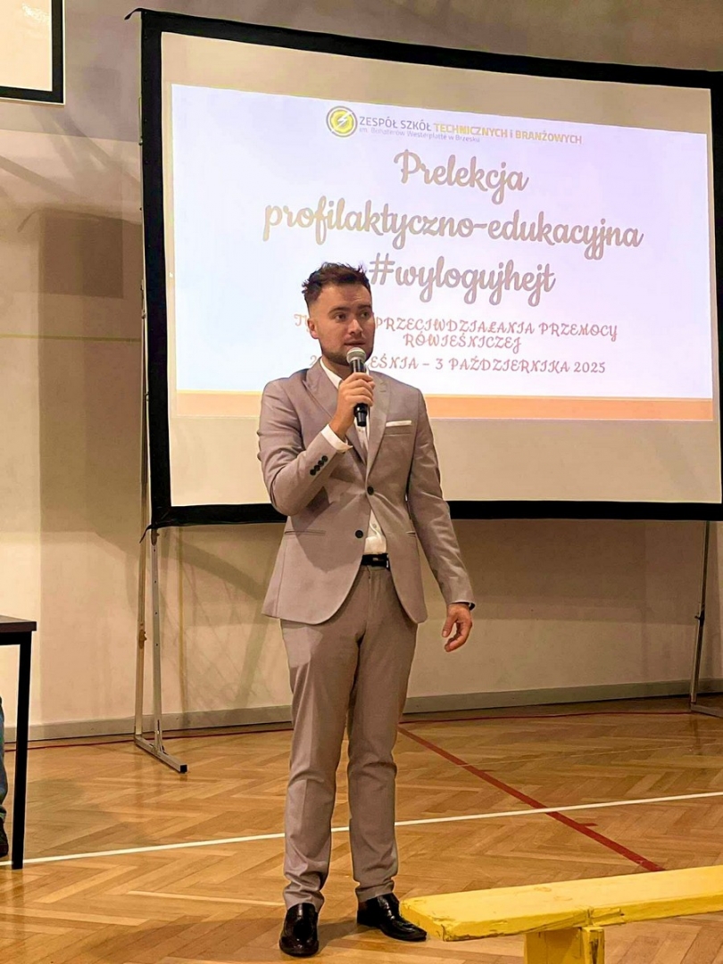Dnia 3 października 2025 roku w Zespole Szkół Technicznych i Branżowych w Brzesku odbyła się wyjątkowa prelekcja pt. „#wylogujhejt”, zorganizowana w ramach ogłoszonego przez Ministerstwo Edukacji Narodowej - Tygodnia Przeciwdziałania Przemocy Rówieśniczej. Spotkanie nie było jednak typowym wykładem – w rolę prelegentów wcielili się uczniowie z klasy 3 TB, którzy w atrakcyjnej formie przybliżyli swoim młodszym kolegom i koleżankom problemy mowy nienawiści. Całość przedsięwzięcia koordynował Pan Daniel Tabiś.