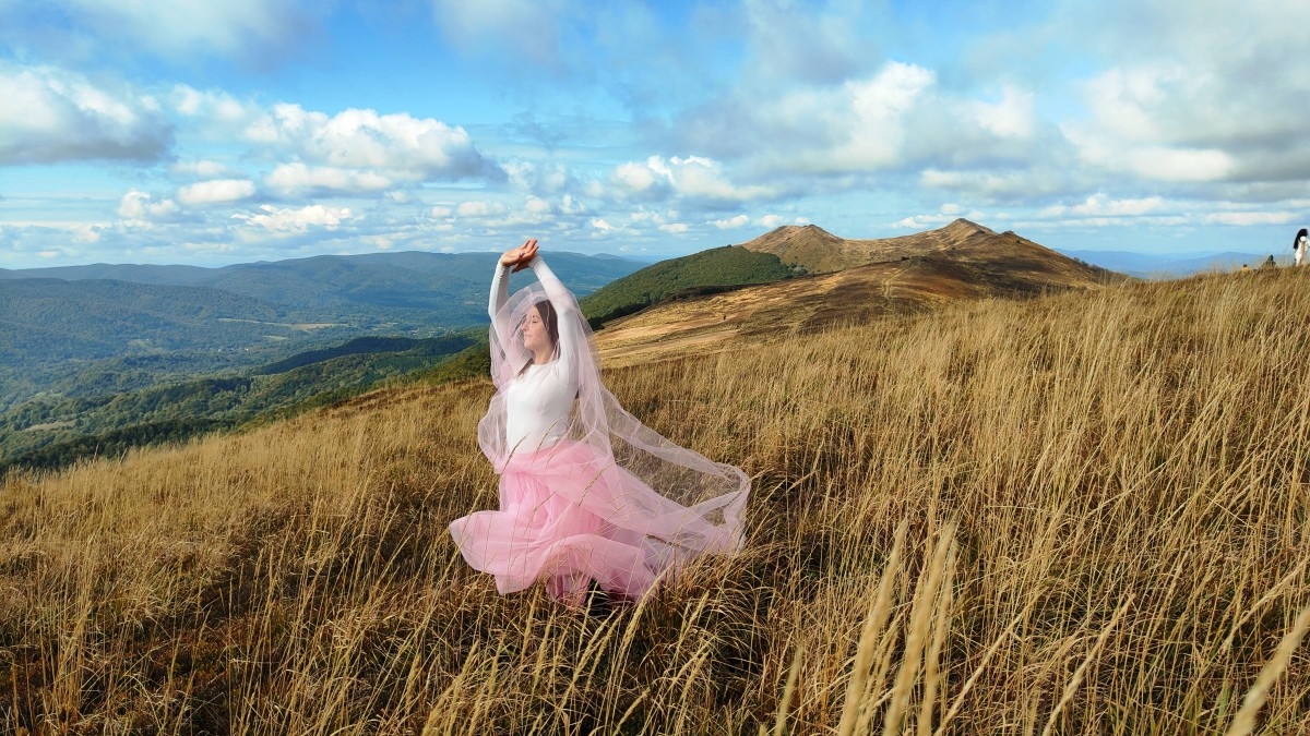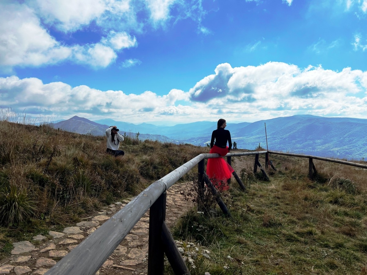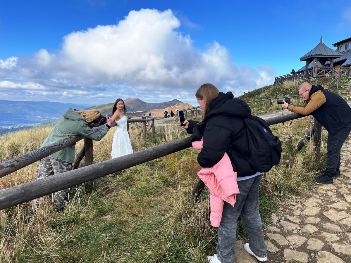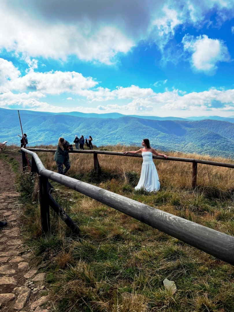 Trasa wiodła przez bieszczadzkie ścieżki aż po grzbiet połoniny, skąd rozpościera się panorama na pasma Smereka i Caryńskiej. Pogoda dopisała: czyste niebo, ciepły wiatr i jesienne słońce, które zamieniało złote trawy w naturalny reflektor. – To światło nie potrzebuje filtrów ani studia – żartowali uczniowie, ustawiając koleżanki i kolegów w surowym, ale niezwykle plastycznym krajobrazie. W obiektywach pojawiły się portrety w stylu retro, zdjęcia stylizowane na epokę wojenną, a także delikatne, pełne ruchu kadry w zwiewnych sukniach. Każde zdjęcie tworzy małą opowieść. O człowieku w przestrzeni, o kolorze, o czasie, który zatrzymuje się na ułamek sekundy.