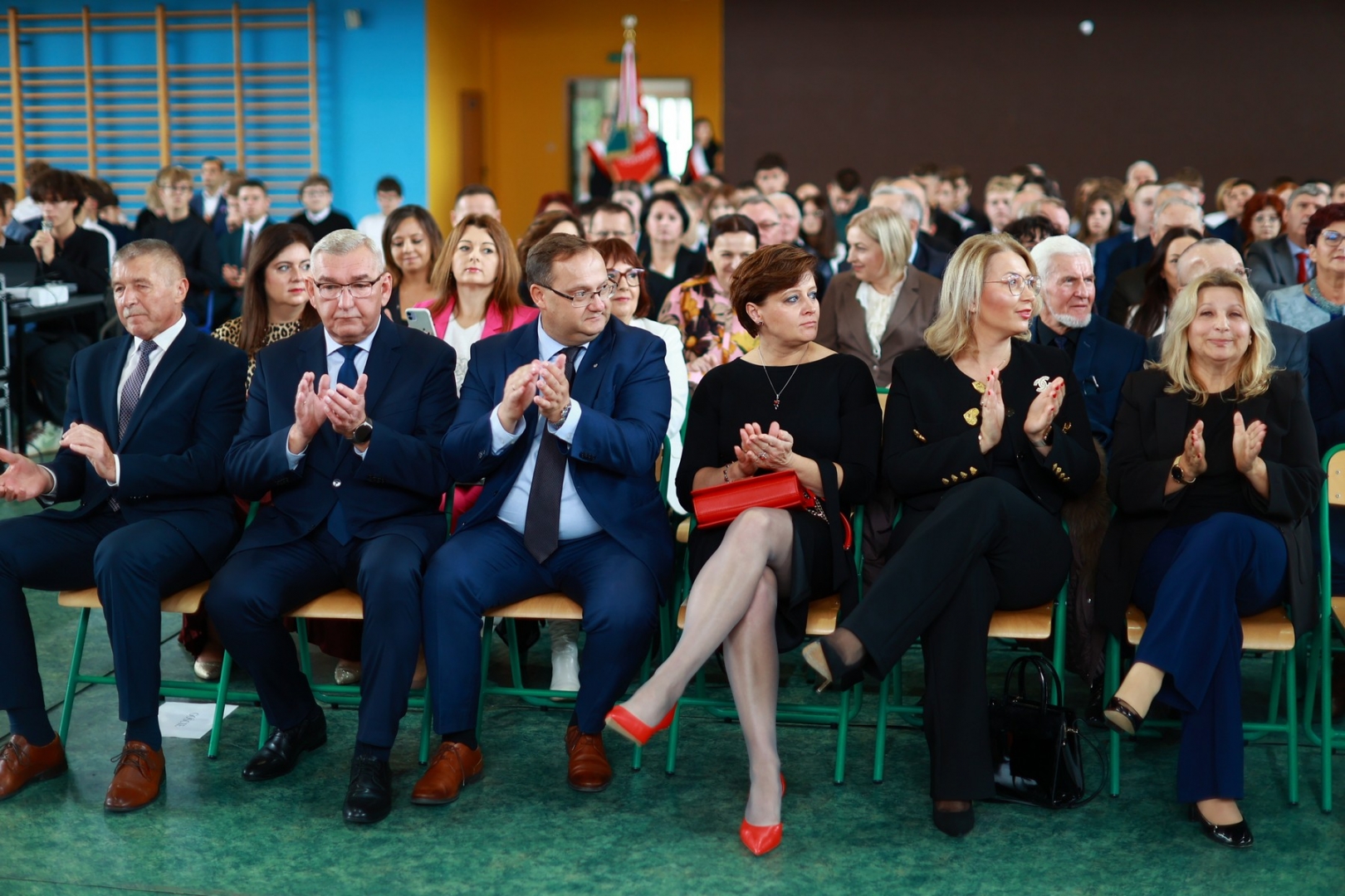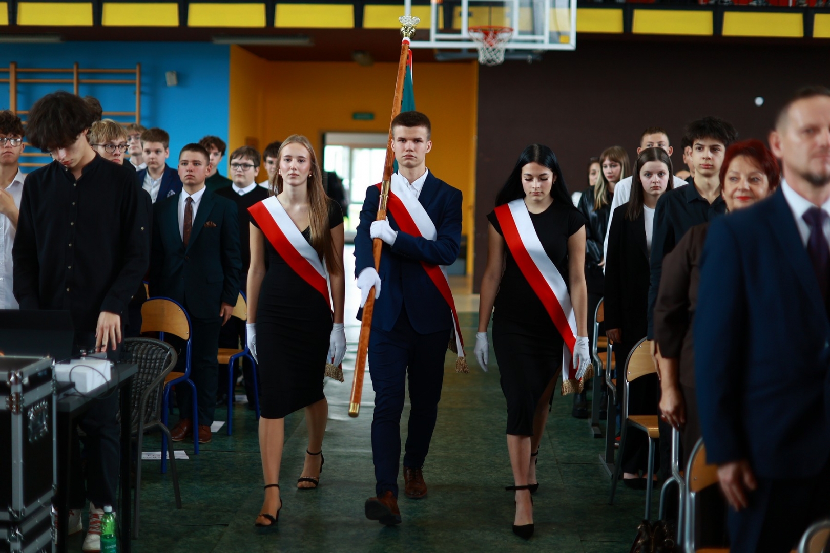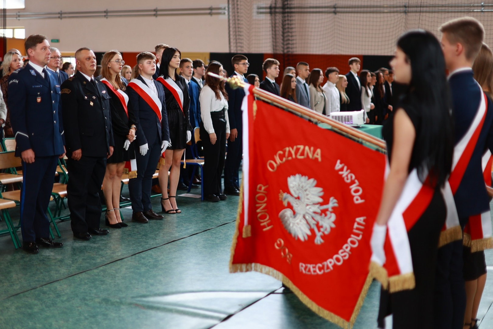 Jednym z najbardziej podniosłych momentów uroczystości było ślubowanie uczniów klas pierwszych na sztandar szkoły. Pierwszoklasiści złożyli uroczyste przyrzeczenie wierności wartościom szkoły, nauce i Ojczyźnie. Następnie odbyło się symboliczne pasowanie repliką szabli majora Henryka Sucharskiego, dowódcy obrońców Westerplatte - patronów szkoły, co dodatkowo podkreśliło historyczny charakter wydarzenia i związek szkoły z dziedzictwem narodowym.