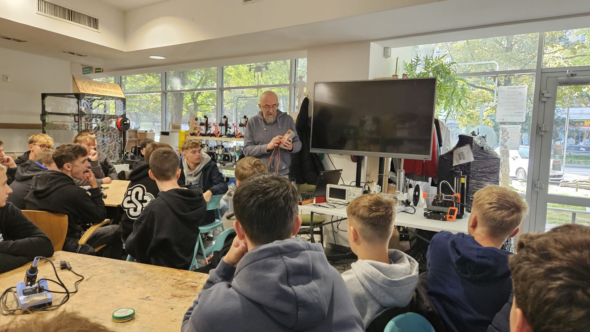 Wizyta odbyła się w FAB LAB Kraków i obejmowała zajęcia teoretyczne oraz praktyczne z zakresu elektrotechniki i elektroniki. Uczniowie wysłuchali krótkiego wykładu o technologii druku 3D, połączonego z pokazem działania drukarki oraz prezentacją dotyczącą pomiarów przy użyciu miernika uniwersalnego.