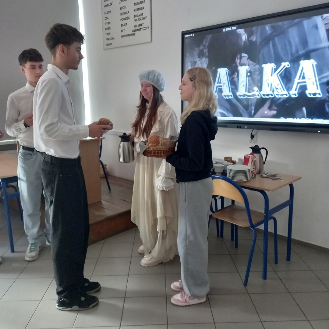 Tak jak w powieści, okazywano szacunek matce pryncypała, witając się z nią i całując ją w rękę oraz zachowując hierarchię: najpierw podchodził stary Jan Mincel, potem rodzina, a następnie pracownicy. Odmienne było to, że smaczne bułeczki kosztowali wszyscy uczniowie kl. 3TH, razem spożywając śniadanie. „Śniadanie w sklepie Mincla” to pierwsza lekcja, prowadzona w ramach projektu edukacyjnego „Lalka” – post scriptum, który realizuje się przy współpracy Muzeum Polin w Warszawie. Jest to już II edycja.