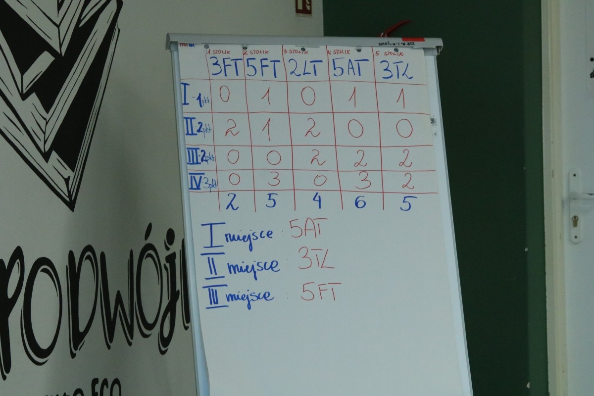 Po wyrównanej walce zwycięską drużyną okazała się reprezentacja klasy 5AT w składzie Klaudia Sowa i Julia Świątkowska. Po dogrywce drugie miejsce zajęła drużyna z klasy 3TL: Justyna Biś i Patrycja Kapusta. Na trzecim stopniu podium stanęły przedstawicielki klasy 5FT: Emilia Duda i Gabriela Grzebieniarz. Pozostałe drużyny również wykazały się ogromną wiedzą na temat funkcjonowania Technikum.