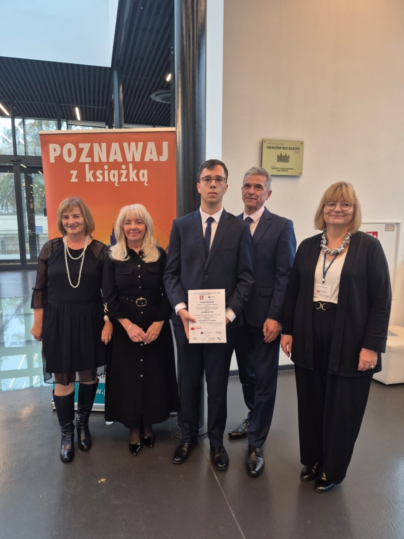 17 listopada 2025 w Muzeum Fotografii w Krakowie odbyła się gala laureatów XIII Ogólnopolskiego Dyktanda Niepodległościowego „Po polsku o historii”. W kategorii szkół ponadpodstawowych naszą szkołę reprezentował Kamil Baniak z kl. 4TMe, który zajął VII miejsce ex aequo z uczennicą 1. Liceum im. B. Nowodworskiego w Krakowie. Konkurs zdominowali uczniowie liceum; wśród laureatów znalazł się, oprócz Kamila, tylko jeden uczeń technikum, z Technikum Elektryczno-Elektronicznego nr 7 w Krakowie. Kamilowi na gali towarzyszyli nauczycielka j. polskiego Anna Skoczek i dyrektor ZSTiB Jerzy Soska. Gościem honorowym uroczystości była poetka Ewa Lipska (na zdjęciu z kwiatami), której wiersz „Dyktando” został odczytany.