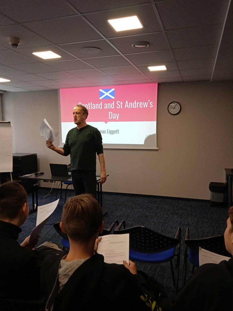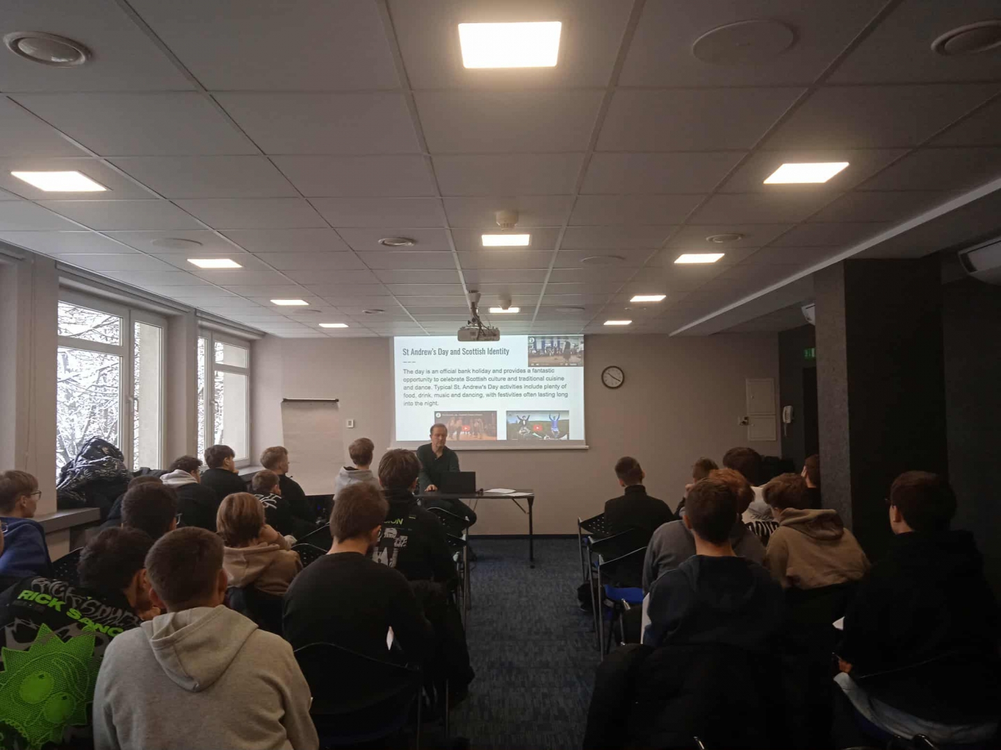 Była to podróż w czasie i przestrzeni, w której prowadzący Thomas Liggett zaprezentował zagadnienia z zakresu historii, geografii i kultury tego regionu. Przedstawił też najpopularniejsze szkockie zwyczaje, szczególnie te związane z obchodami Dnia Świętego Andrzeja. Zajęcia miały charakter warsztatowy, więc uczniowie brali udział w zadaniach interaktywnych z wykorzystaniem materiałów dodatkowych.
