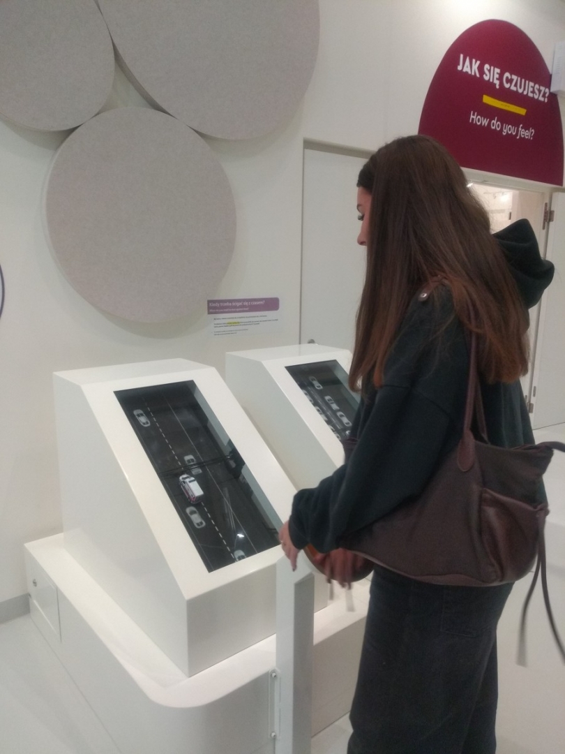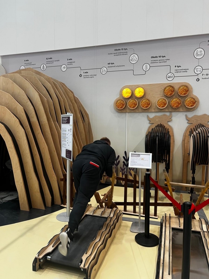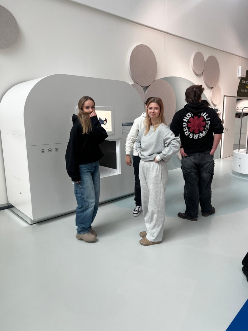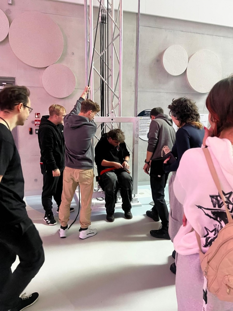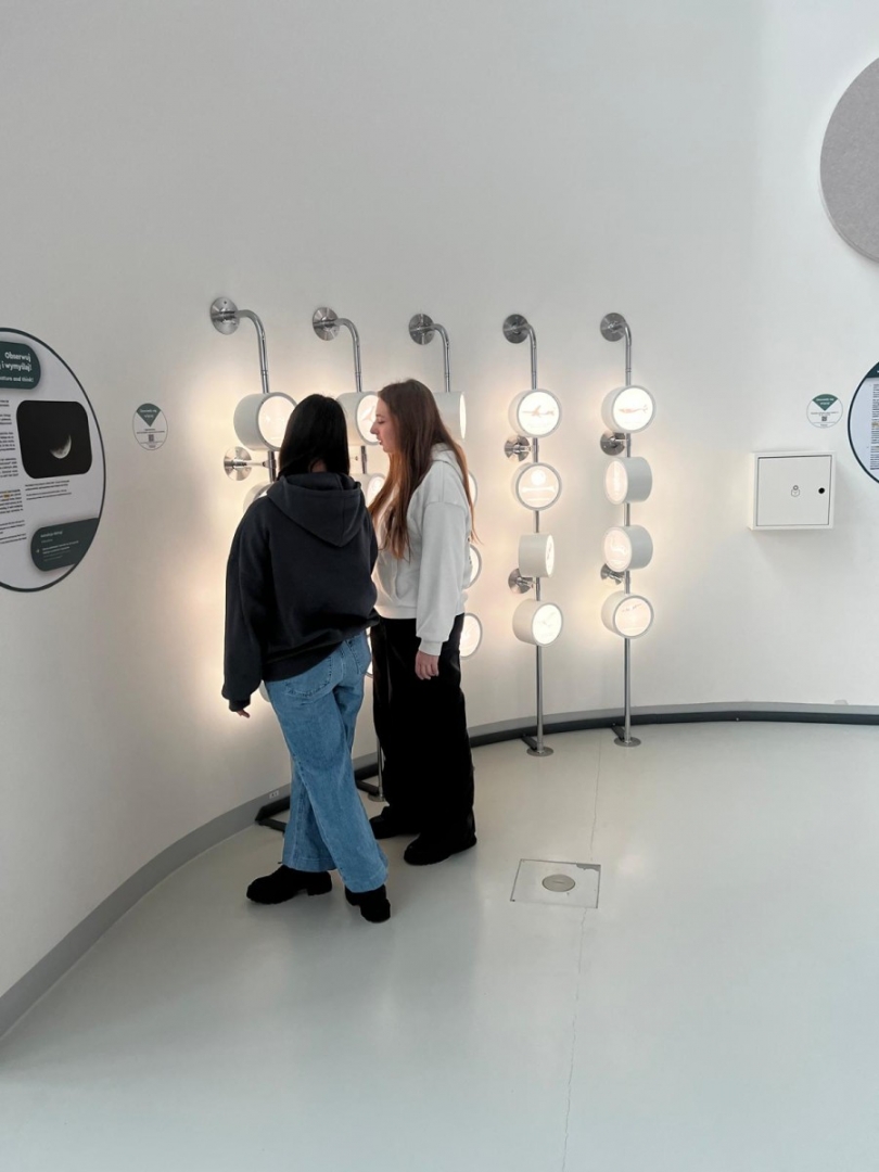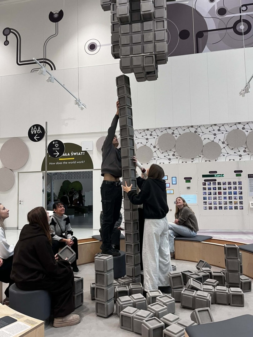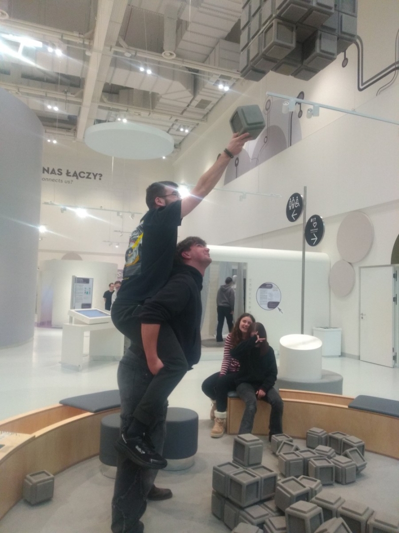 Zaraz po wejściu do budynku młodzież trafiła na dużą wystawę poświęconą człowiekowi i jego relacjom ze światem. Ekspozycja składa się z ponad stu stanowisk interaktywnych, przy których każdy może samodzielnie eksperymentować, sprawdzać swoje reakcje, refleks, siłę i kreatywność. Uczniowie z zainteresowaniem testowali urządzenia pokazujące działanie zmysłów, mechanizmów ruchu czy podstawowych praw fizyki. Dużo emocji wywołały stanowiska związane z komunikacją i współpracą – to właśnie tam przekonaliśmy się, kto potrafi świetnie działać zespołowo.