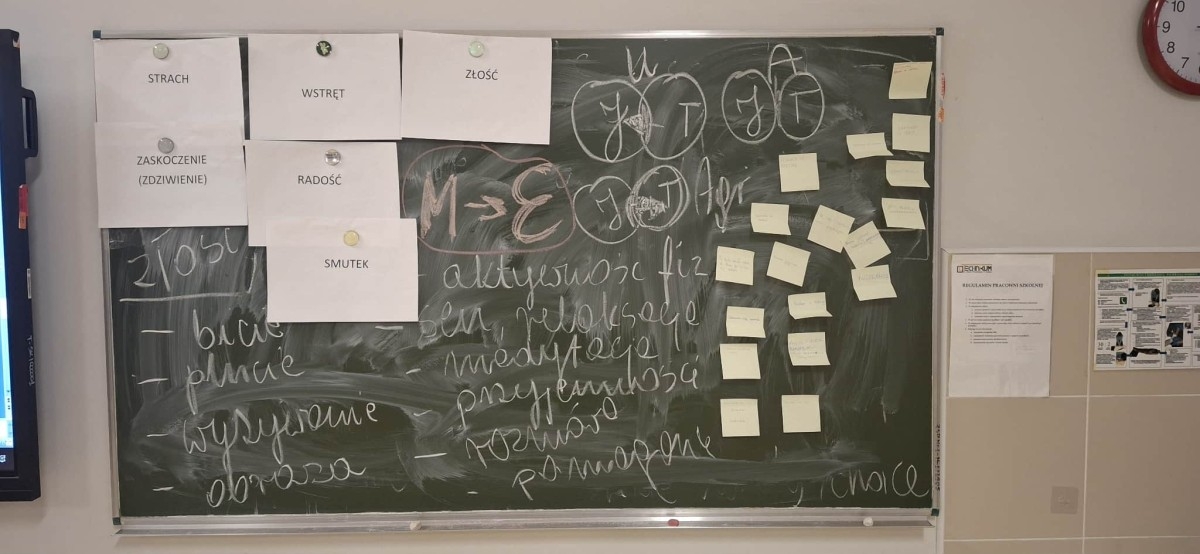 ‘Na początku spotkania podkreśliliśmy, co odróżnia emocje od uczuć, a co je łączy. W dalszej kolejności otrzymaliśmy karteczki z opisanymi sytuacjami, po których rozważeniu mieliśmy za zadanie wcielić się w opisaną rolę i podzielić się swoimi przemyśleniami. Następnie przeanalizowaliśmy nasze umiejętności panowania nad emocjami poprzez wypełnienie krótkiej ankiety. Pod koniec zajęć zapisaliśmy na karteczkach nasze obawy związane z wyjazdem, po czym podzieliliśmy się nawzajem swoimi rozważaniami na forum grupy.
