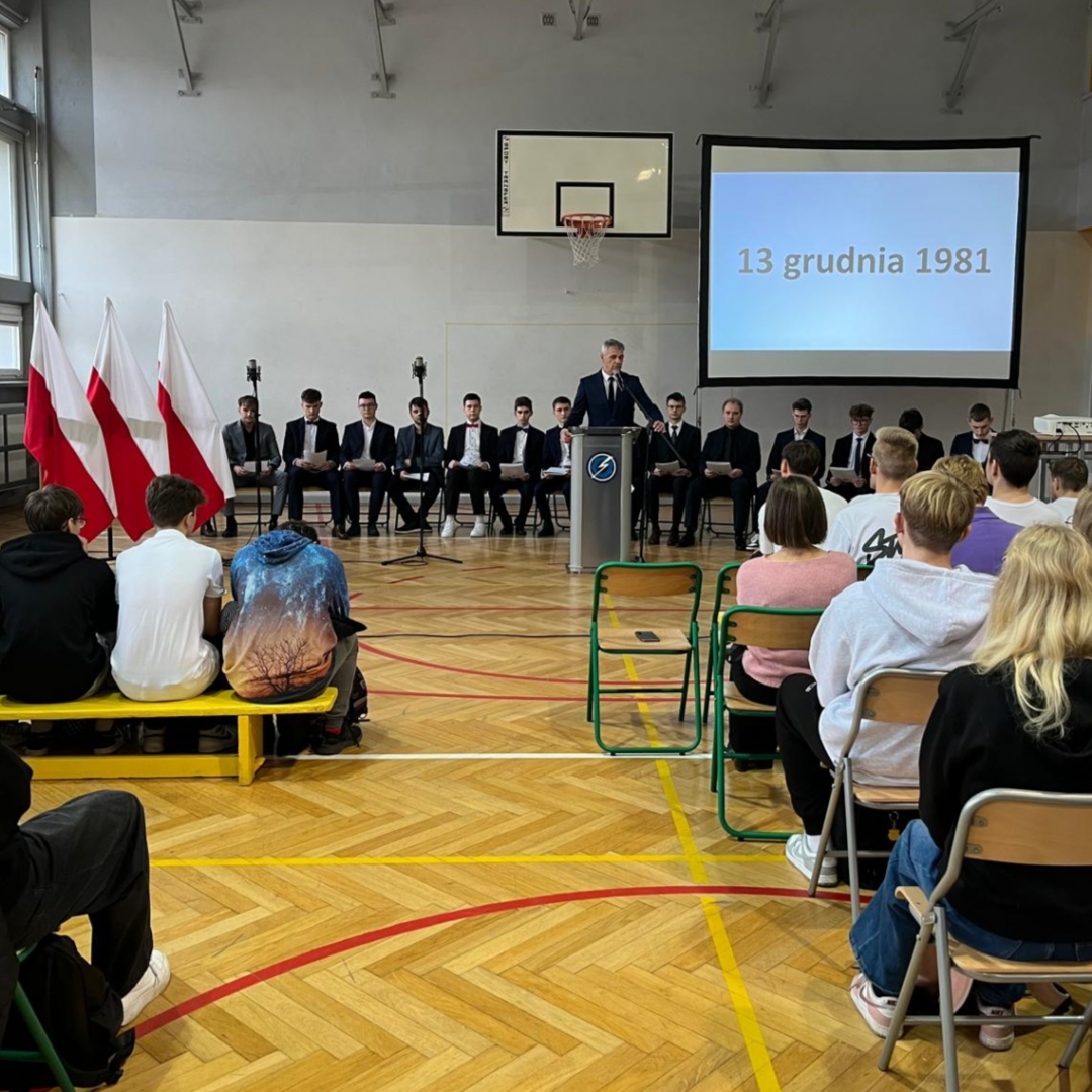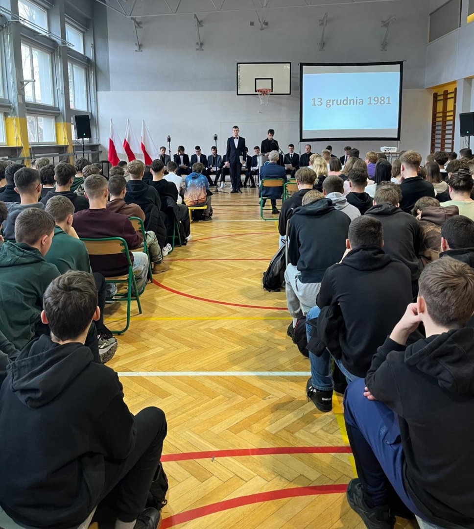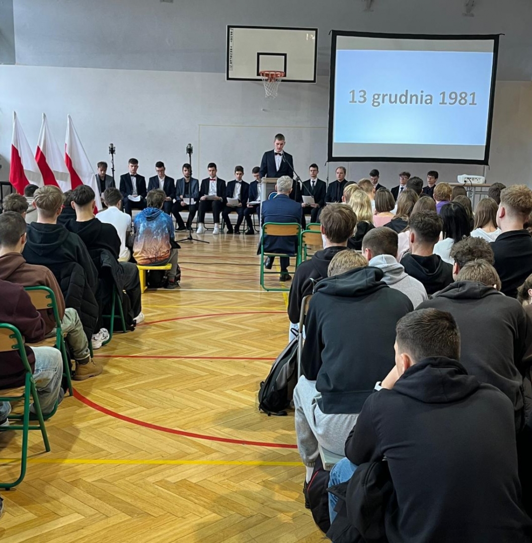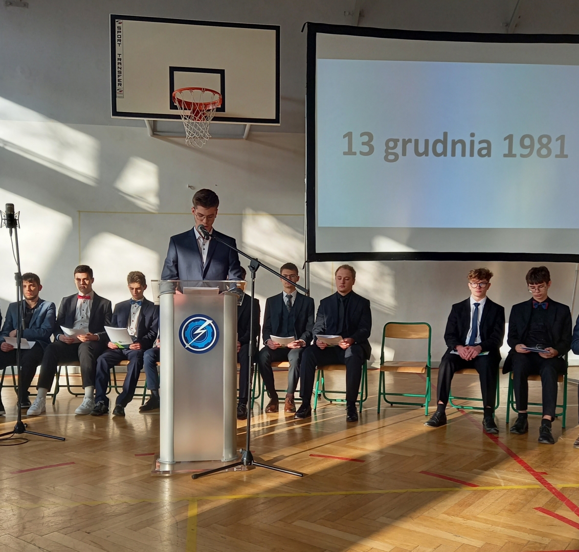 W 2025 roku uczniowie klasy 5 TE zaprezentowali historię stanu wojennego za pomocą wierszy tego czasu. W poezji stanu wojennego wyróżniamy dwa nurty: lirykę „wysokiego obiegu”, której przedstawicielami są m.in. Czesław Miłosz, Zbigniew Herbert, Stanisław Barańczak, Julian Kornhauser, Adam Zagajewski oraz anonimową, okolicznościową poezję, powstałą w ośrodkach internowania, której autorami są nieprofesjonalni twórcy. Filip Miller odczytał wiersz Cz. Miłosza „Do Lecha Wałęsy” (pierwszy nurt), a Piotr Armański – „Idą pancry na Wujek” (drugi nurt). Pozostałe wiersze, wraz z okolicznościami ich powstania, były odczytywane we fragmentach, stosownie do dat i wydarzeń, do których nawiązywały: 13 grudnia 1981, 16 grudnia 1981, 28 grudnia 1981, 25 stycznia 1982, 1 maja 1982, 3 maja 1982, 13 maja 1982, 14 maja 1982, 13 października 1982. Referaty przygotowano w oparciu o książkę "Poezja świadectwa i sprzeciwu. Stan wojenny w twórczości wybranych polskich poetów". Ilustrację muzyczną stanowiły archiwalne nagrania, m.in. piosenki śpiewanej przez Jana Krzysztofa Kelusa „Ostatnia szychta na KWK Piast”, Krystyny Prońko – „Psalm stojących w kolejkach” i „Mury” Jacka Kaczmarskiego. Przypomniano wykonanie uczniów sprzed 4 lat, wówczas 1TE, a w całości utwór zaśpiewała klasa 3 TB.