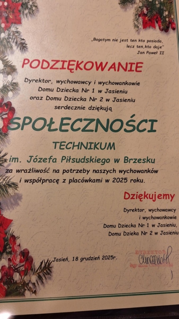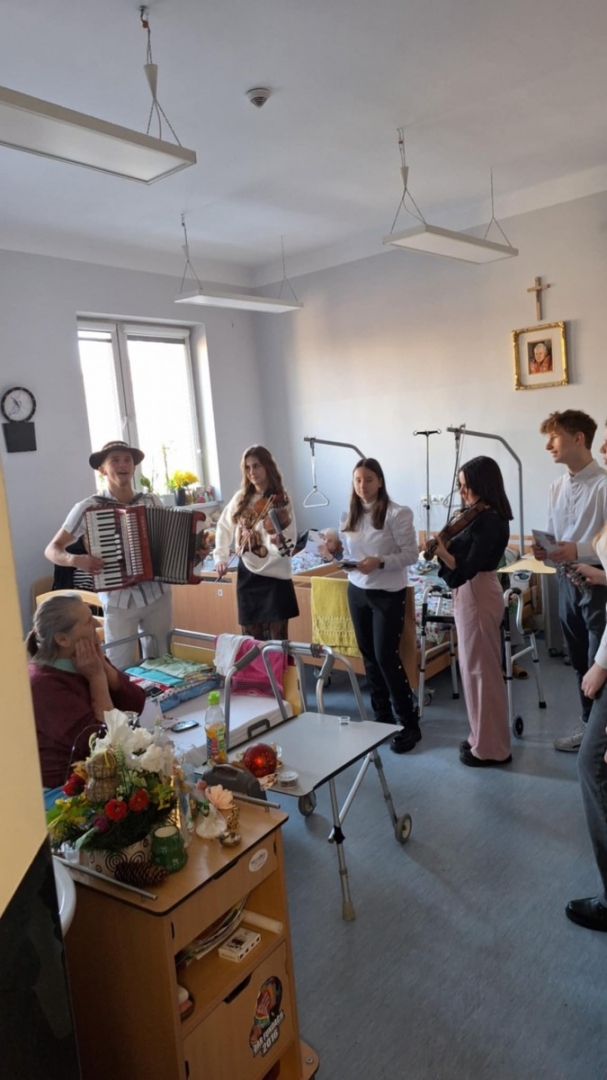 18 grudnia wolontariusze z Technikum wraz z p. dyrektor G. Piotrowską, p. Dorotą Pamuła, p. Dorotą Tomczyk odwiedzili z kolędą pacjentów PP ZOL i Hospicjum w Brzesku oraz podopiecznych Domu Dziecka w Jasieniu. Dzięki drobnym gestom, życzliwości i obecności wolontariusze choć na moment wnieśli świąteczne ciepło tam, gdzie jest ono szczególnie potrzebne. Taka wizyta uczyła wrażliwości na drugiego człowieka, przypomniała, że obecność, śpiew kolęd, a nawet zwykły uśmiech mogą mieć ogromną wartość.