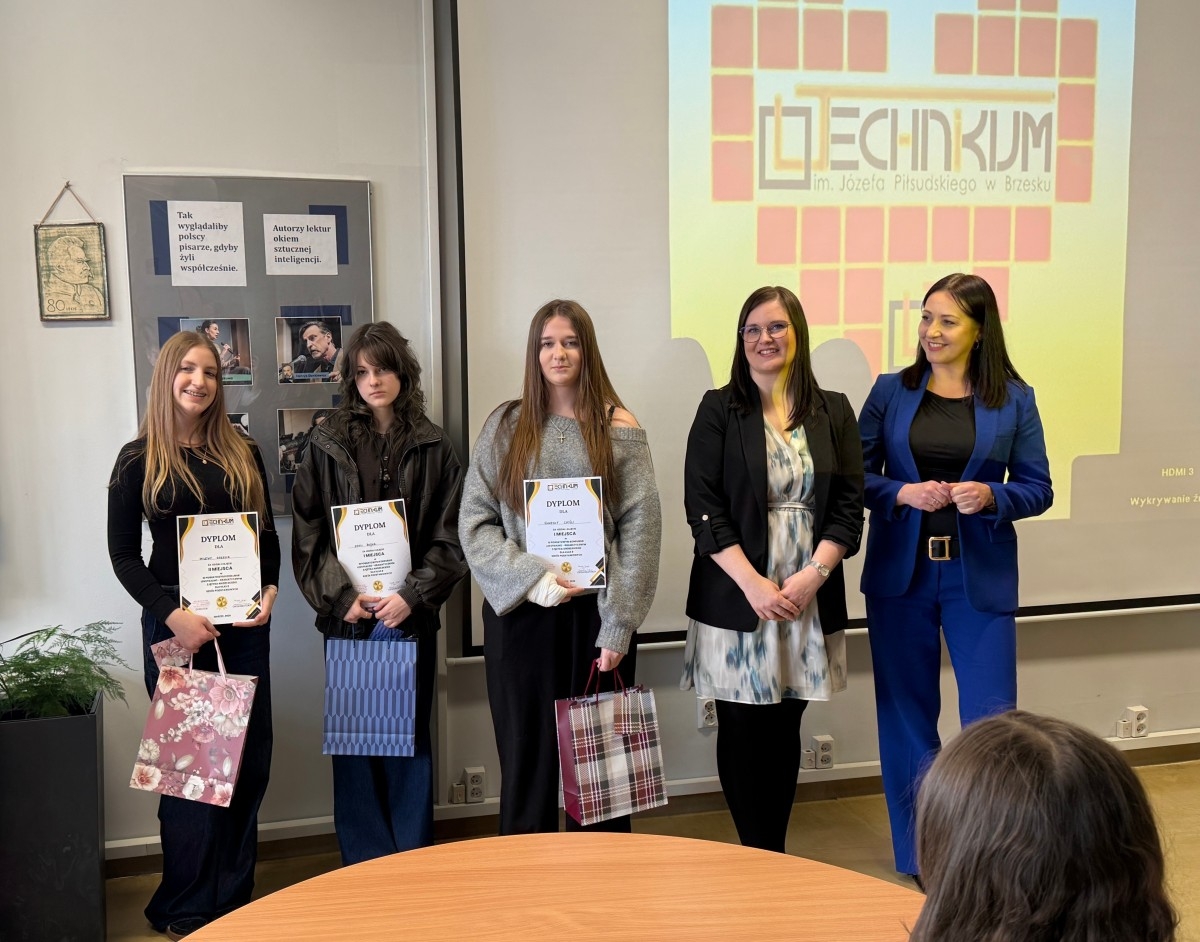 Pani Wicedyrektor Technikum im. J. Piłsudskiego Magdalena Urbaś wraz z organizatorami konkursu pogratulowały wszystkim uczestnikom konkursu oraz wręczyły nagrody laureatom Konkursu. Pozostali uczestnicy konkursu otrzymali drobne upominki ufundowane przez Starostwo Powiatowe w Brzesku.
