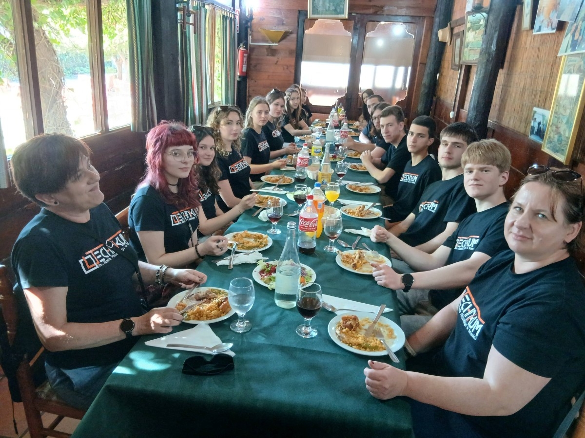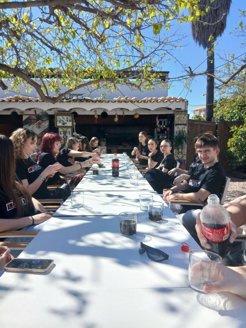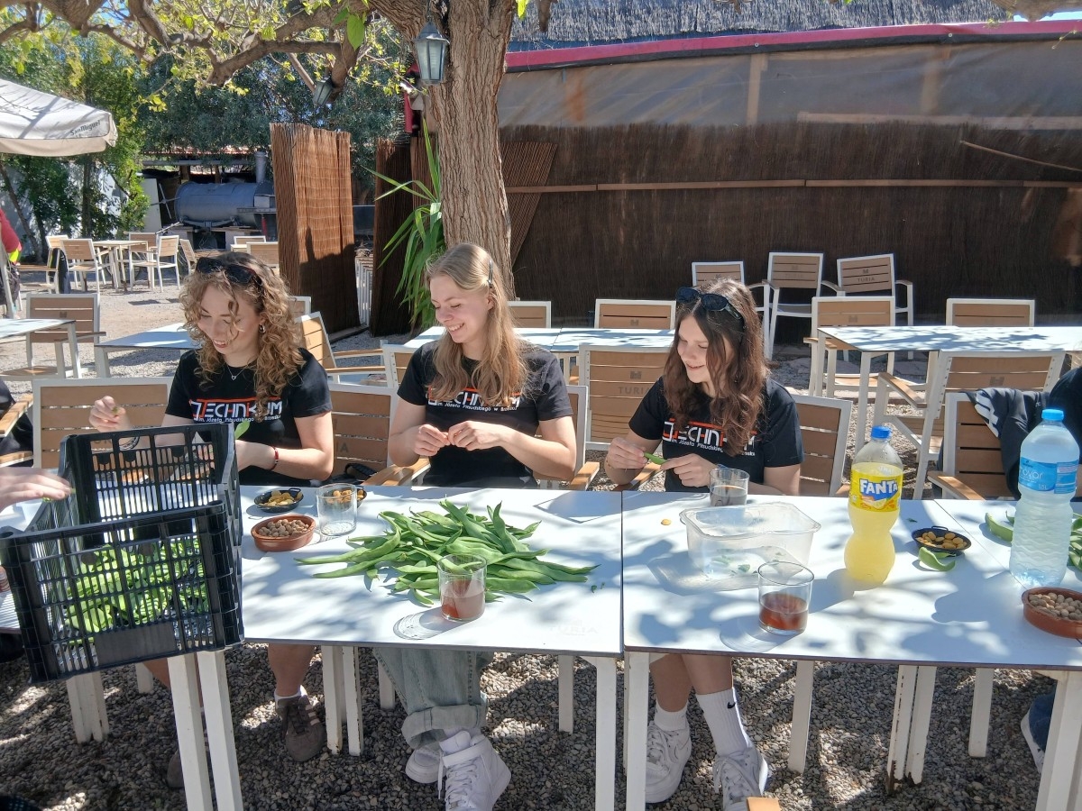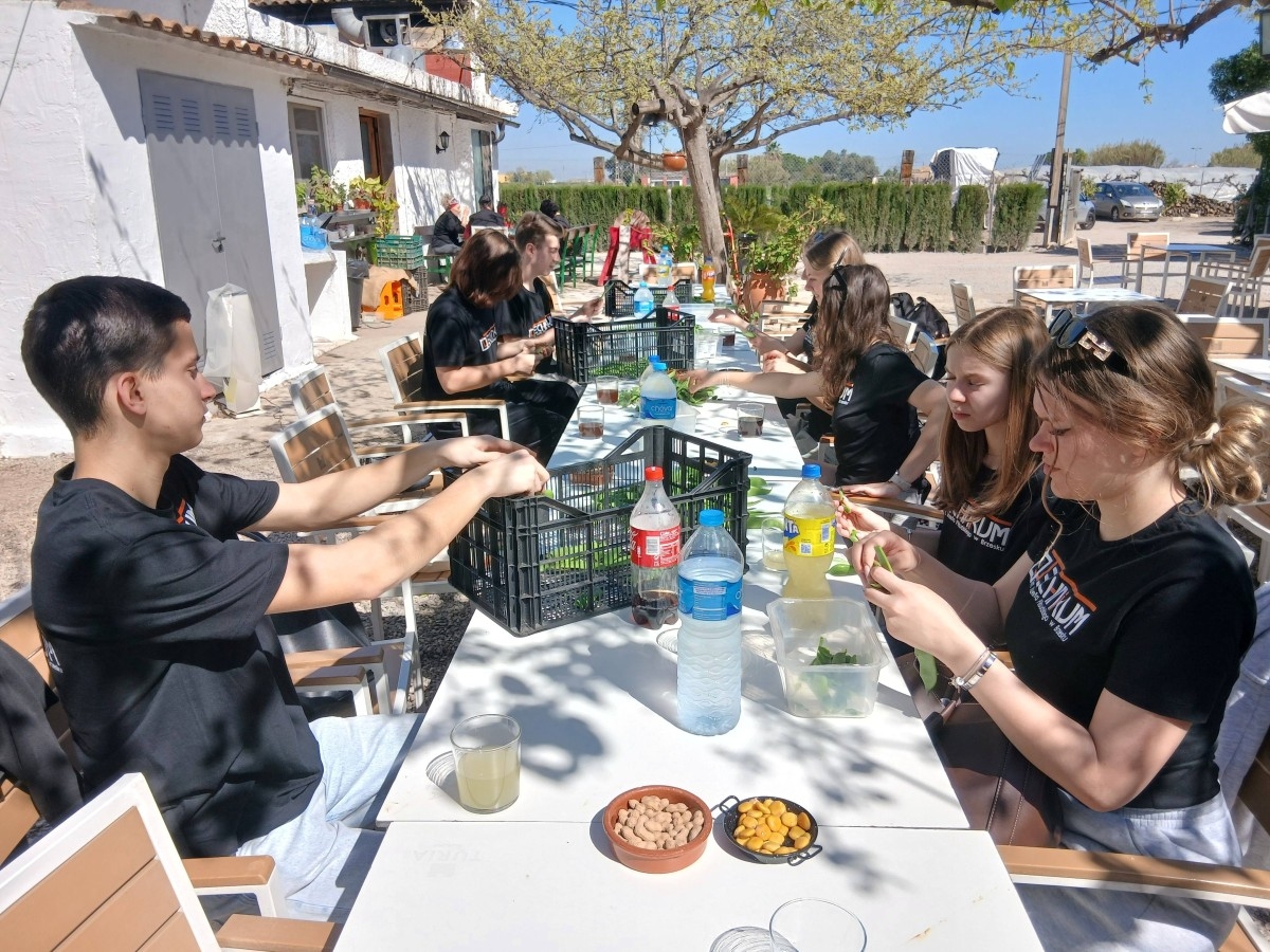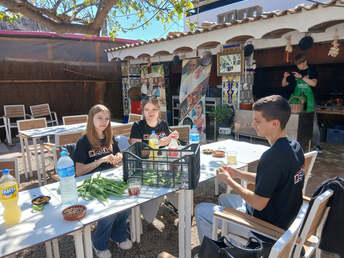 W ostatni dzień pobytu nasza grupa wzięła udział w lekcji gotowania paelli, w czasie której poznaliśmy historię potrawy oraz jej składniki i pomogliśmy w przygotowaniu posiłku. Dzięki uprzejmości gospodarzy skosztowaliśmy lokalnych owoców i warzyw oraz wzięliśmy udział w przejażdżce po okolicy. Zwieńczeniem popołudnia była uczta składająca się z typowych hiszpańskich tapas, przygotowanej przez nas paelli, a także tradycyjnego ciasta dyniowego. Tajemnicą tego dnia pozostanie informacja, gdzie są ślimaki, które miały być jednym ze składników potrawy.
