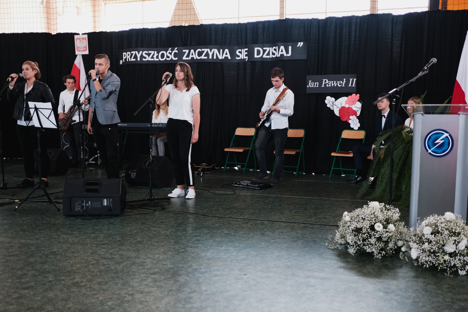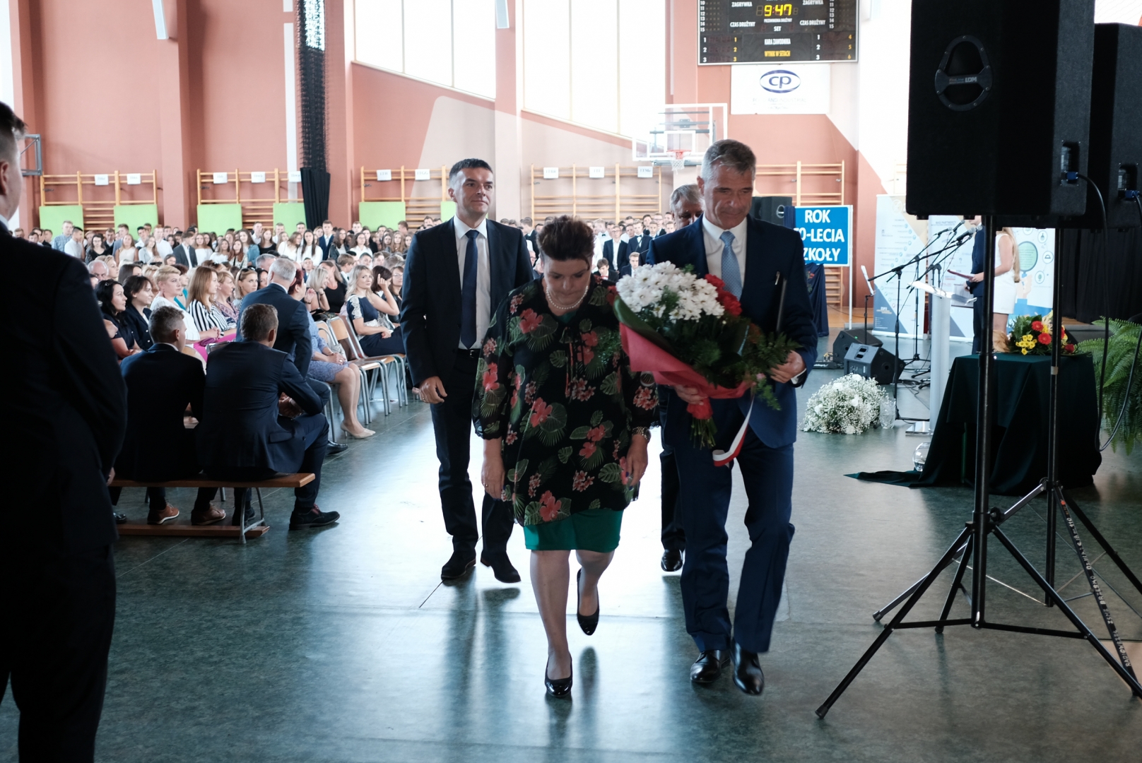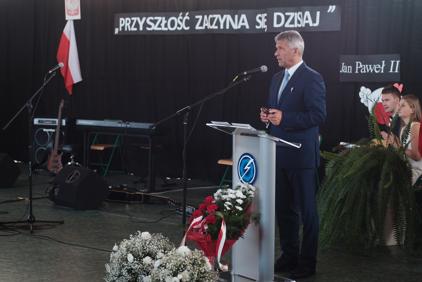 Dyrektor Jerzy Soska powitał przybyłych gości oraz całą społeczność szkolną, życząc wszystkim owocnej pracy oraz sukcesów w rozwoju osobistym i zawodowym i nawiązując do wyjątkowości obecnego jubileuszowego roku szkolnego. Oczywiście, szczególnie serdeczne powitanie spotkało 305 uczniów klas pierwszych rozpoczynających swoją edukacyjną przygodę w naszej placówce.