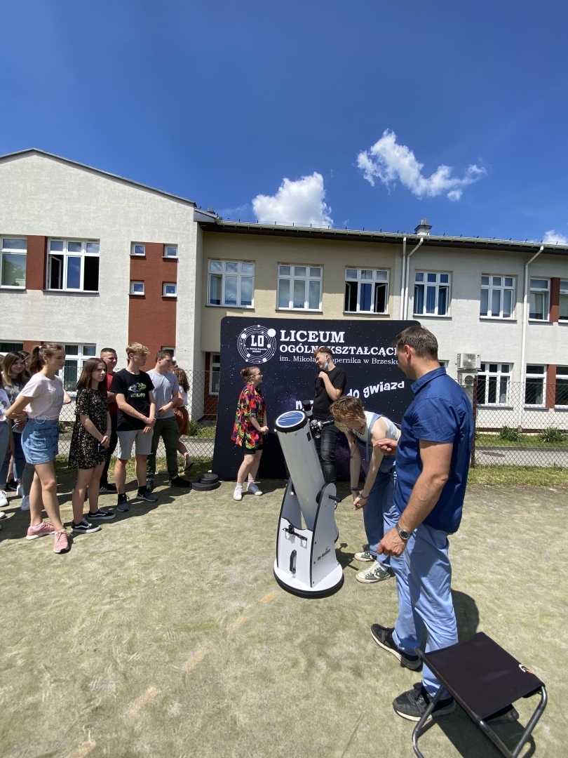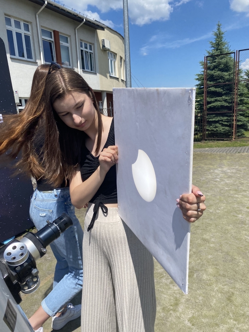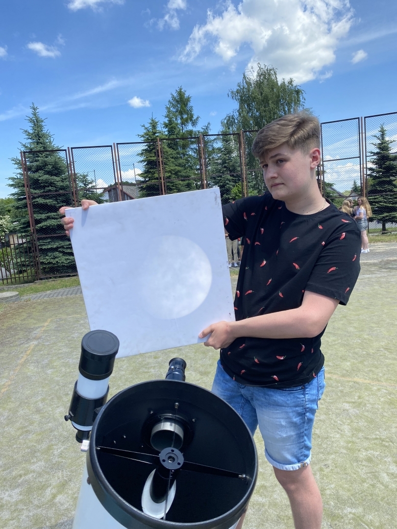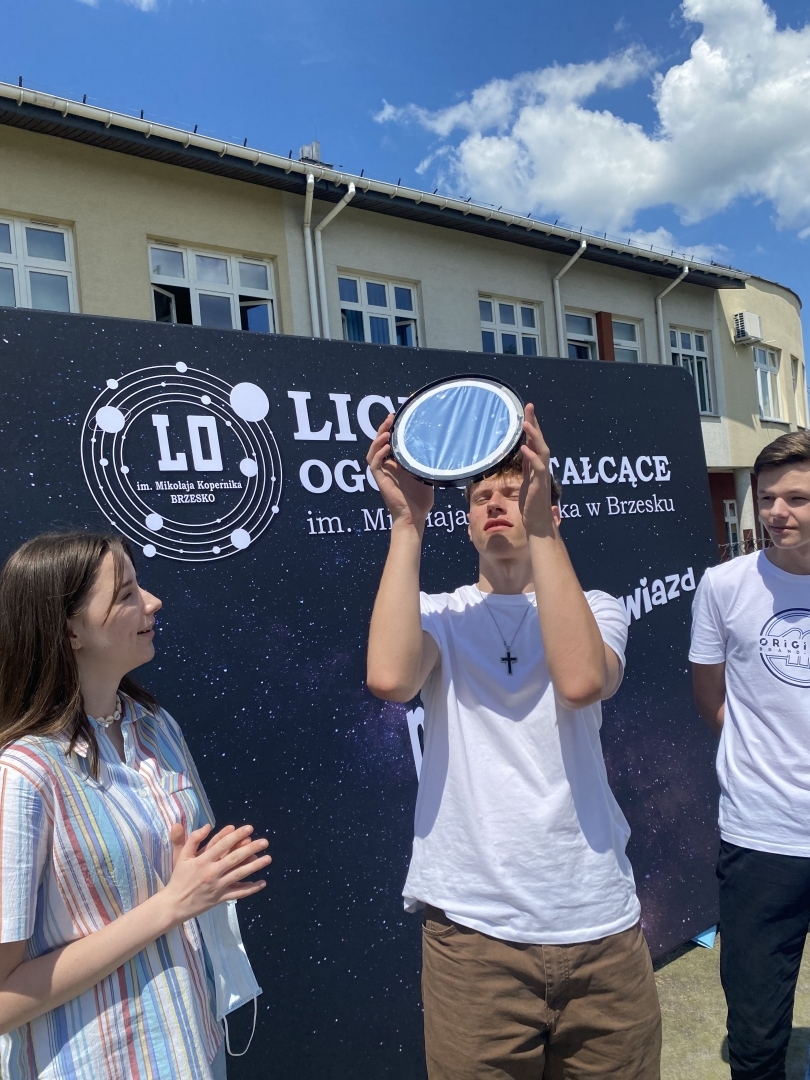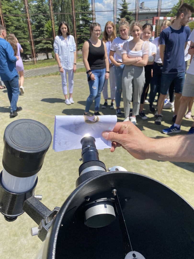 W czwartek 10 czerwca 2021r. pan Marcin Madej - nauczyciel fizyki z Liceum Ogólnokształcącego im. M. Kopernika w Brzesku oraz czworo uczniów z klasy 2B zorganizowali obserwację częściowego zaćmienia Słońca, w której wziąć udział mogli wszyscy uczniowie LO Kopernik. Młodzież mogła oglądać to pasjonujące zjawisko na trzy różne sposoby. Pierwszym z nich była obserwacja bezpośrednia za pomocą filtra. Uczniowie byli dość zaskoczeni, ponieważ Słońce okazało się dużo mniejsze niż się spodziewali - rozmiarami przypominało Księżyc. Drugim sposobem była obserwacja zjawiska przez teleskop zabezpieczony specjalnym filtrem słonecznym. Trzecią metodą była bezpośrednia projekcja - obraz zaćmienia prezentowany był na ekranie ustawionym obok teleskopu.